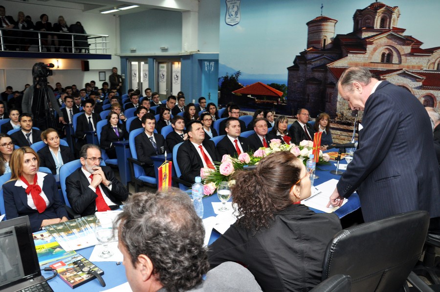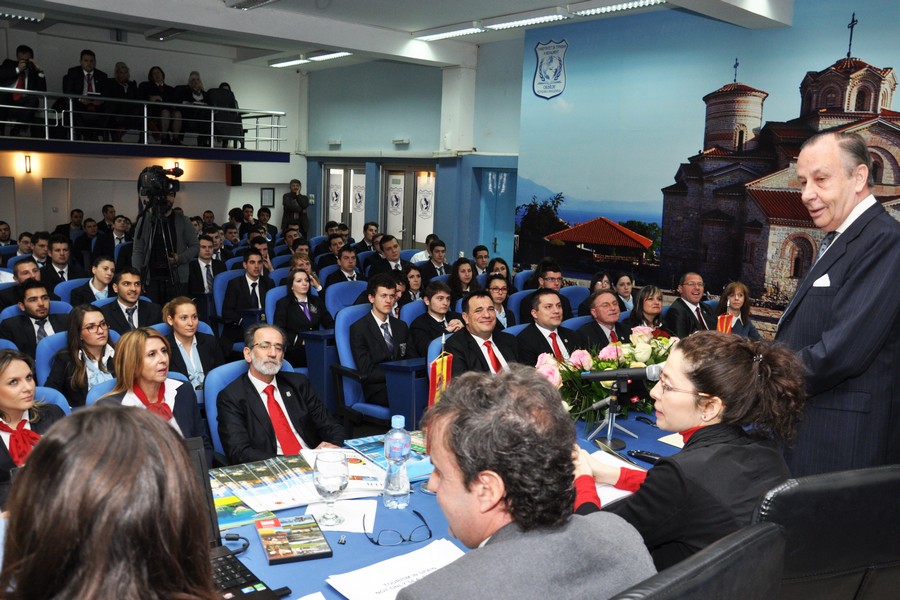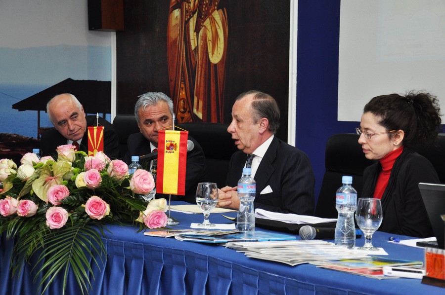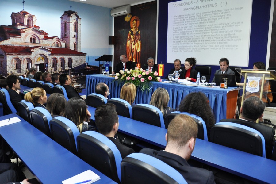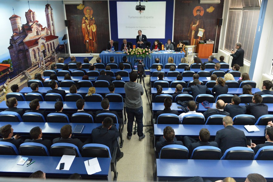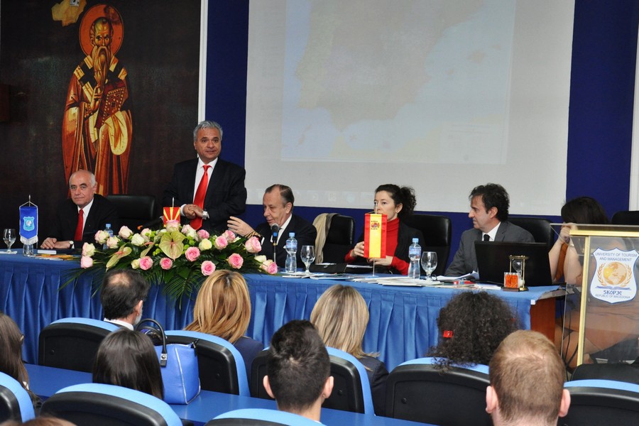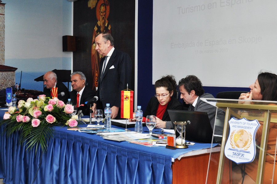 Универзитетот за туризам и менаџмент Скопје, согласно веќе воспоставената практика на учество на гости предавачи, имаше можност да биде домаќин на амбасадорот на Кралството на Шпанија во Република Македонија, неговата екселенција Фернандо Де Галаинена, кој беше придружуван од неговата заменичка г-ѓа Естер Мартин и експертот за туризам г-дин Анхел Кирога. На предавањето на кое покрај студентите од УТМС, присуствуваше целокупниот наставен кадар од Универзитетот, од името на Ректорот на УТМС, високата делегација од Шпанија ја поздрави Проректорот за меѓународна соработка Проф. Д-р Зоран Ивановски, кој потенцираше дека присуството на шпанската делегација на УТМС е од особено значење за студентите, бидејќи со ова предавање ќе имаат можност да добијат комплетна слика за Шпанија, како една од најдобрите туристички дестинации во светот.